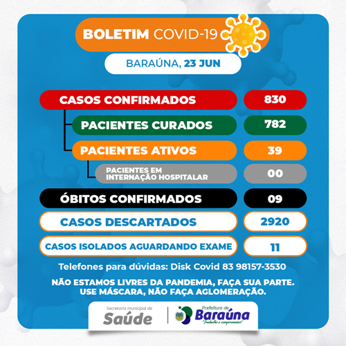 Covid 19: Cai para 43 os casos ativos da doença em Picuí. Confira o boletim.