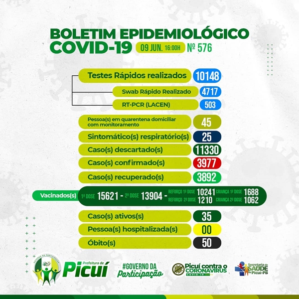 Confira o boletim da Covid 19 de Picuí PB, nesta quinta-feira (09).