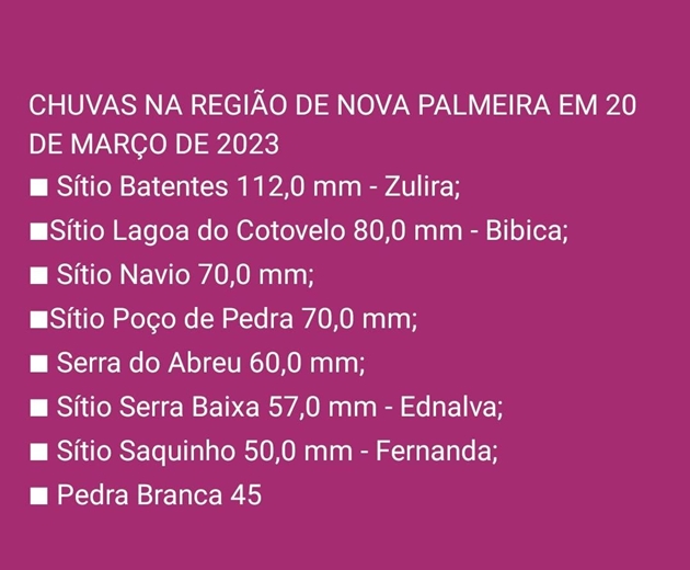 Confira números das chuvas caídas no município de Nova Palmeira nesta segunda-feira (20).